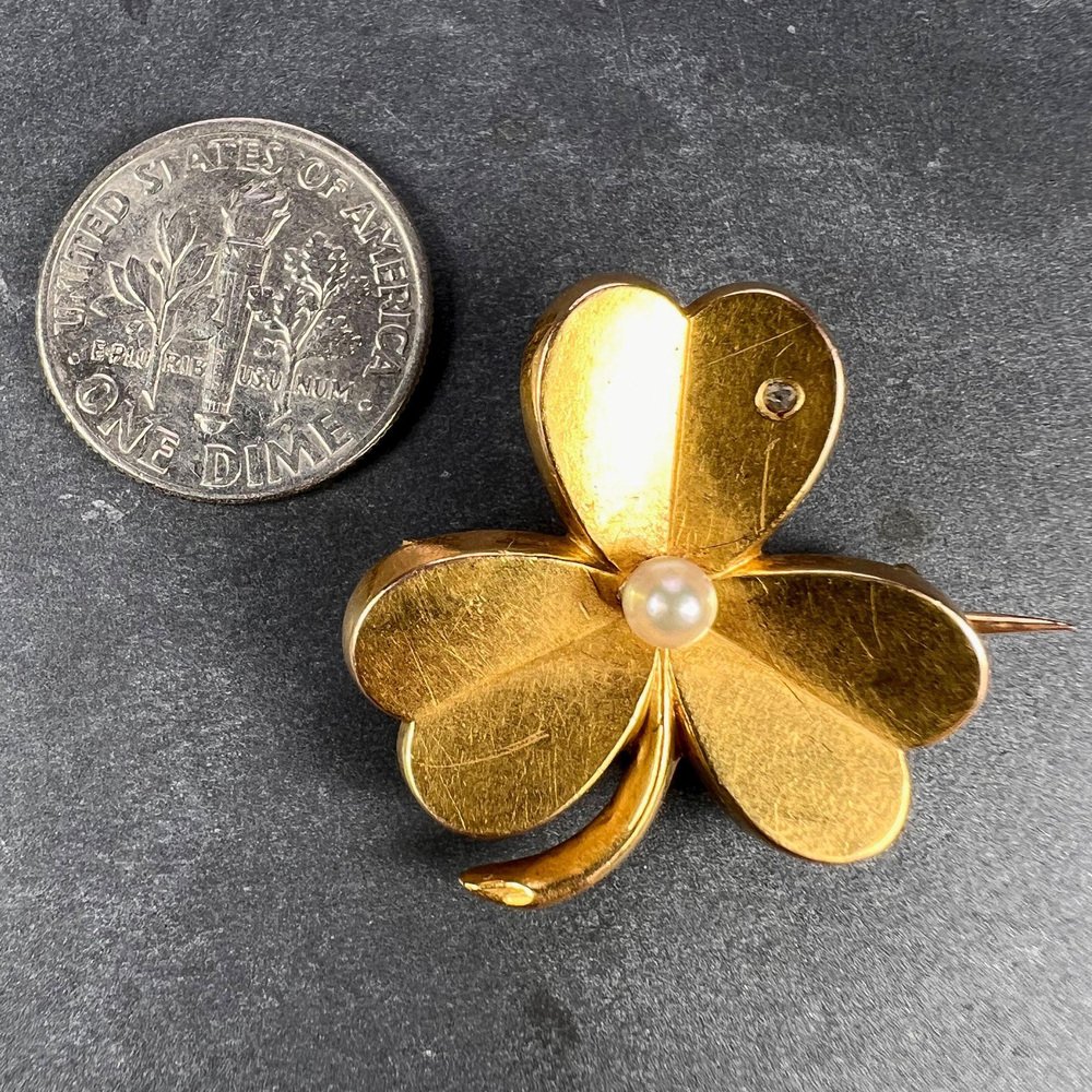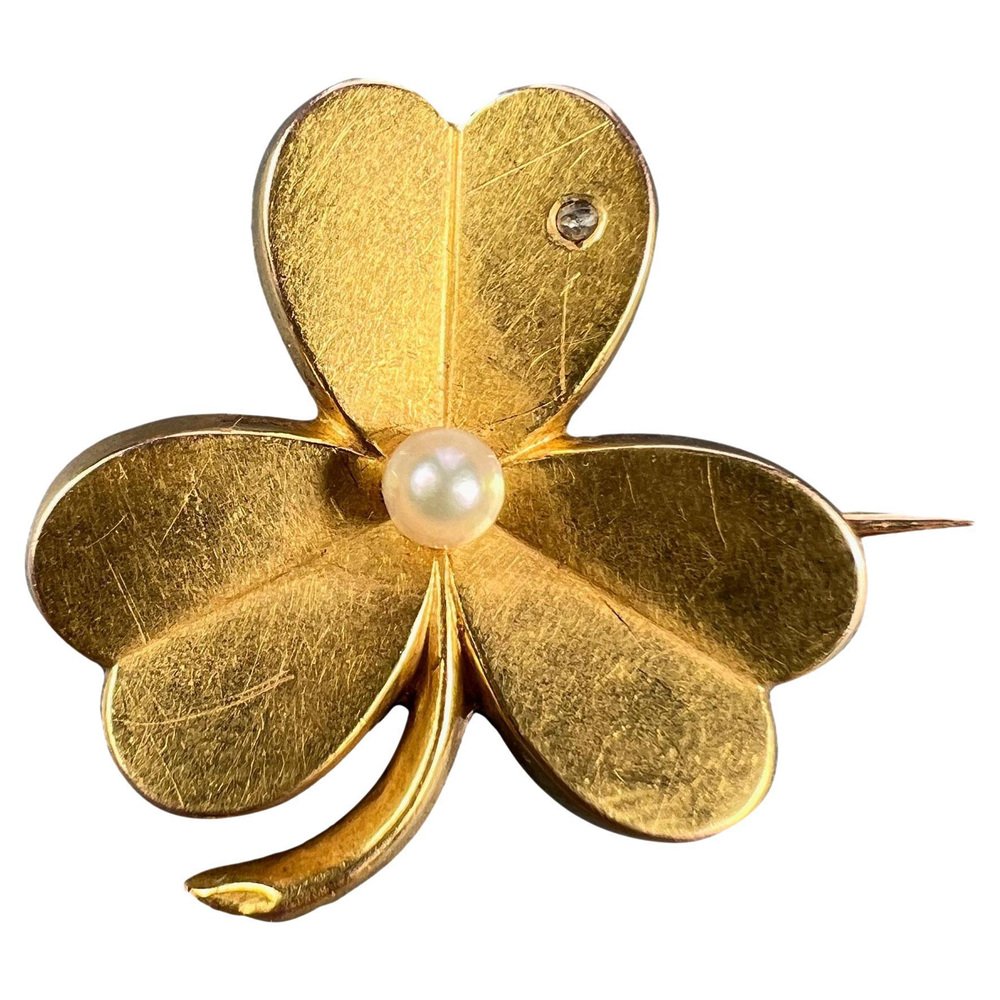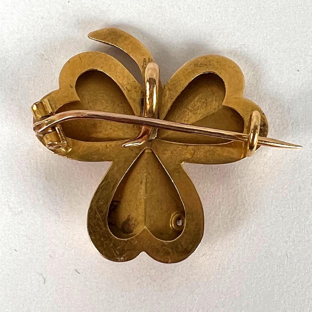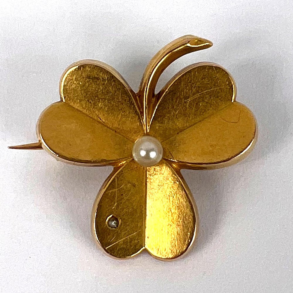French Clover 18k Yellow Gold Pearl Diamond Pendant Brooch, 1890s