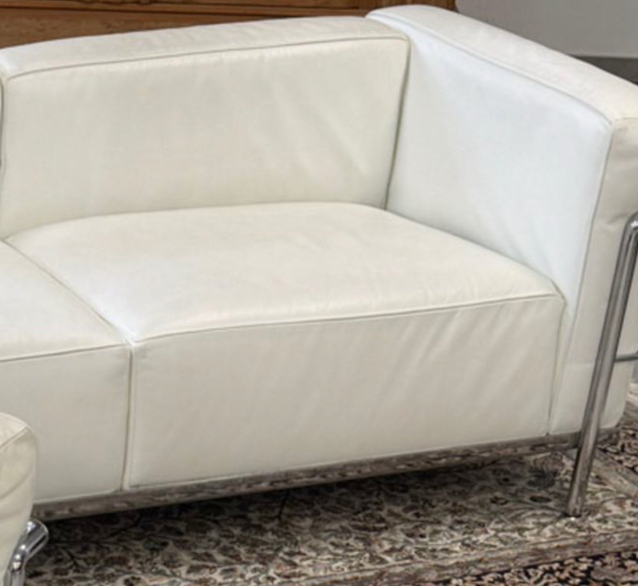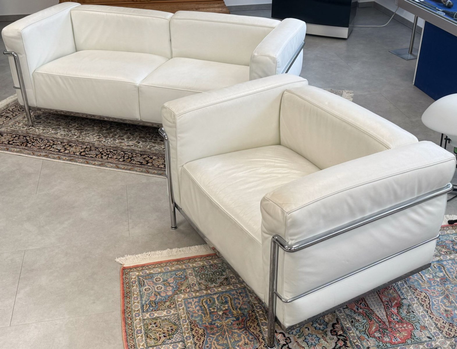LC2 Two-Seater Sofa and Chair in White Leather by Le Corbusier & Pierre Jeanneret for Cassina, 1970s, Set of 2