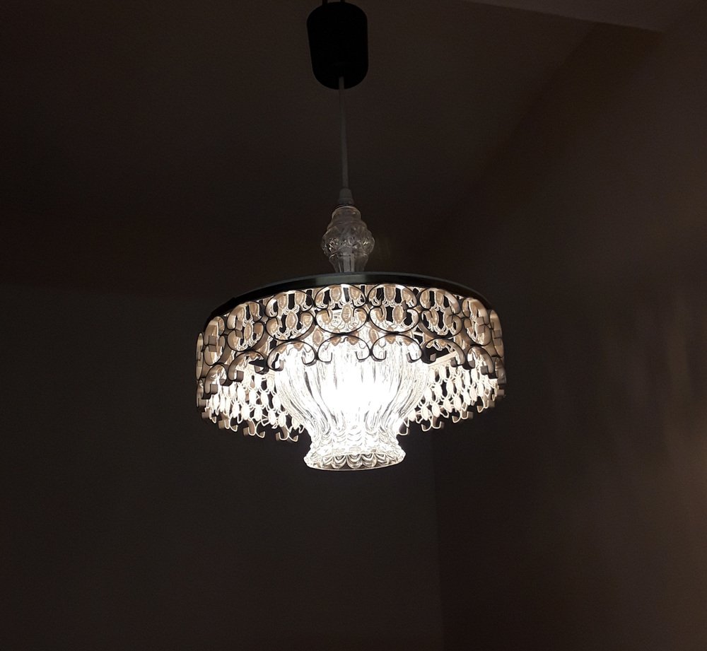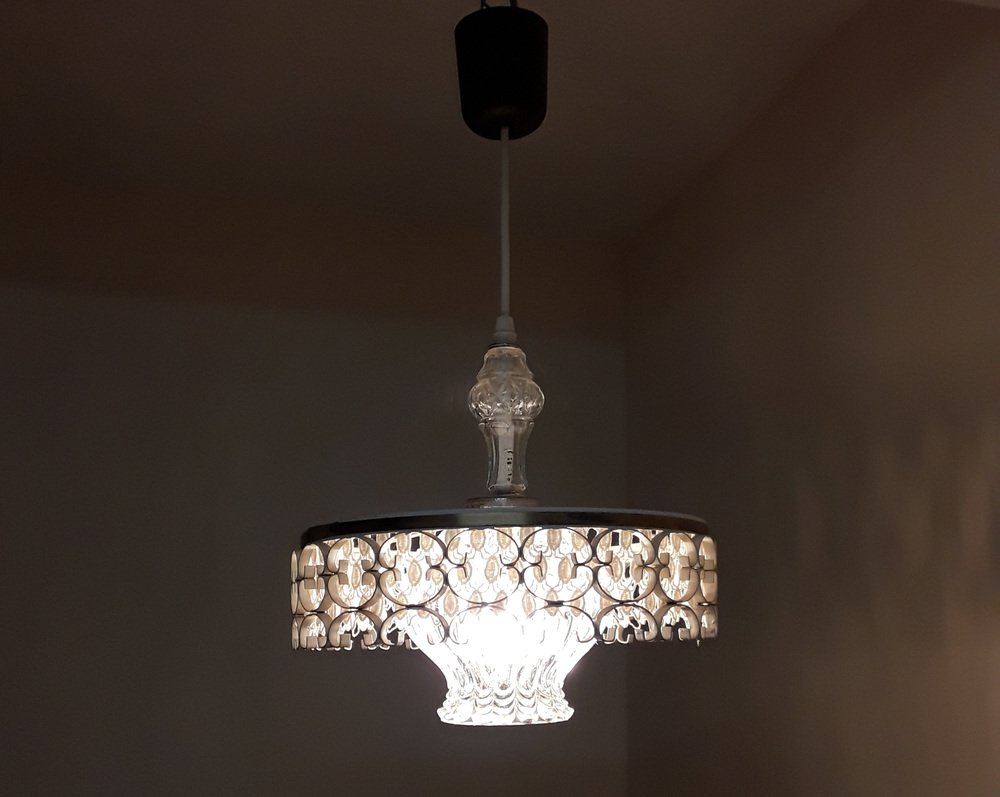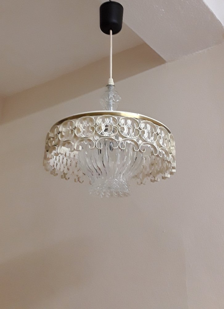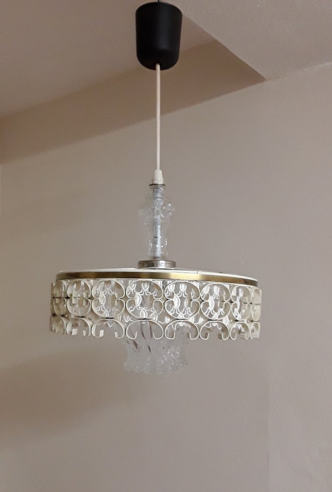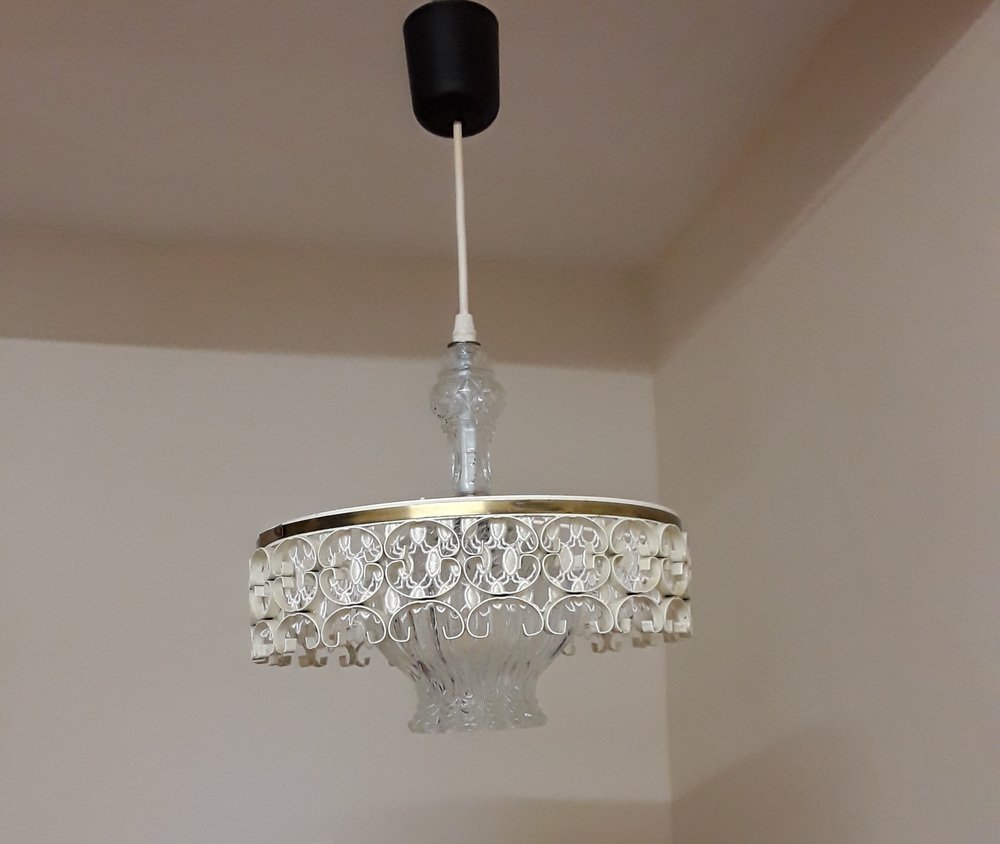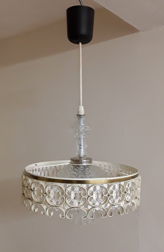 Vintage Ceiling Lamp with Cream-White Metal Screen and Inner Glass Screen of Brass Mount, 1970s